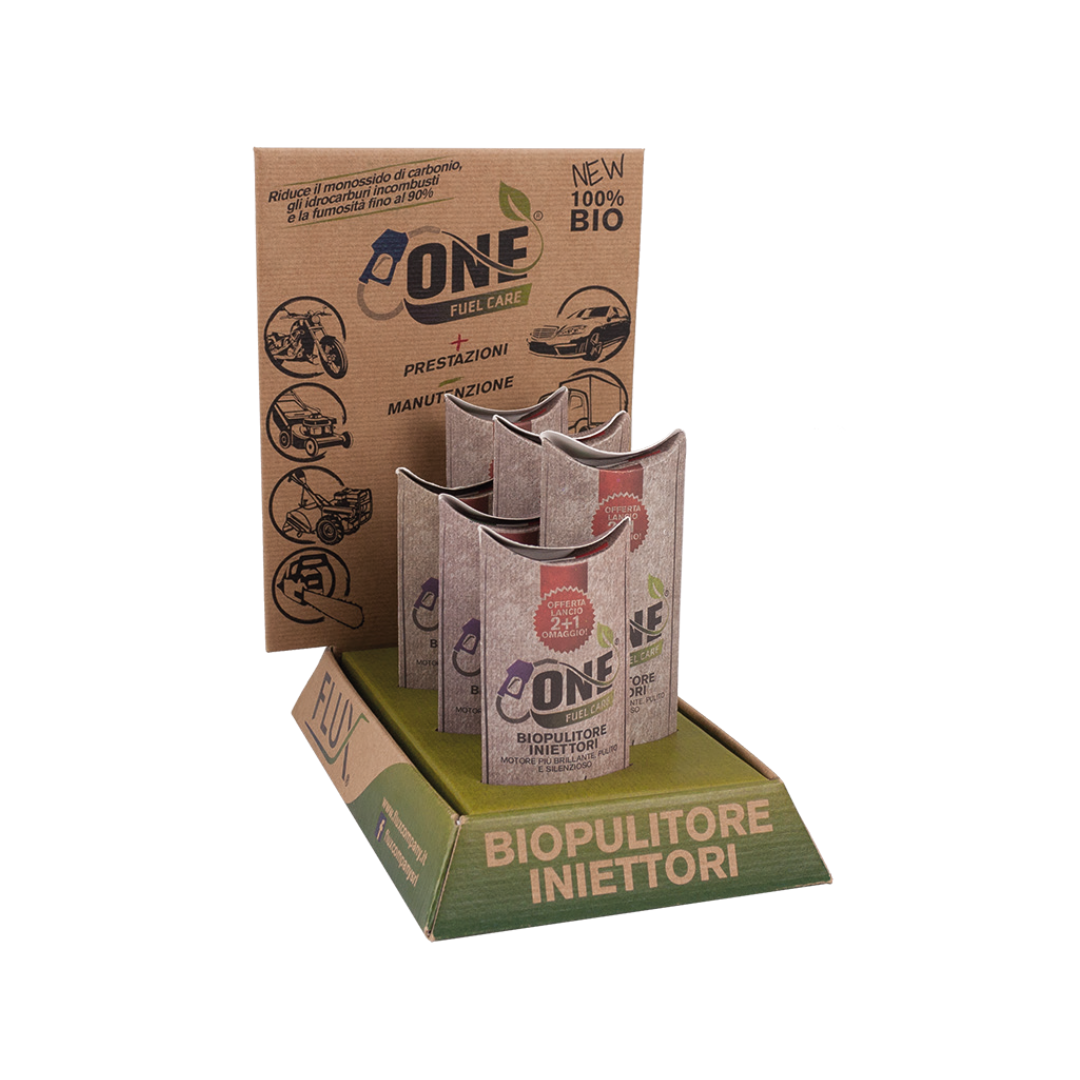 L’espositore ONE FUEL CARE contiene confezioni da 3 fiale monodose pronte all’uso: un formato pratico e accattivante per i clienti, ideale per la fase d’urto, ovvero la pulizia iniziale del motore.